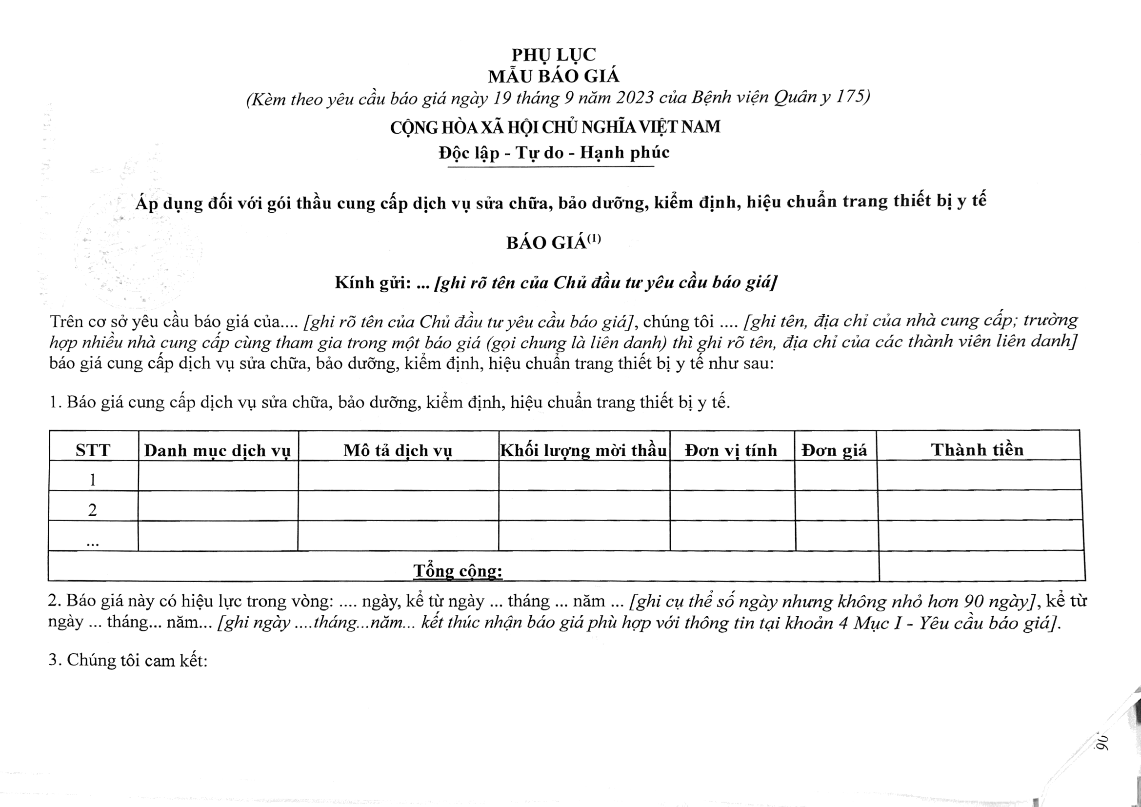 - Đơn vị yêu cầu báo giá: Bệnh viện Quân y 175, 786 Nguyễn Kiệm, P.3, Q. Gò Vấp, TPHCM.