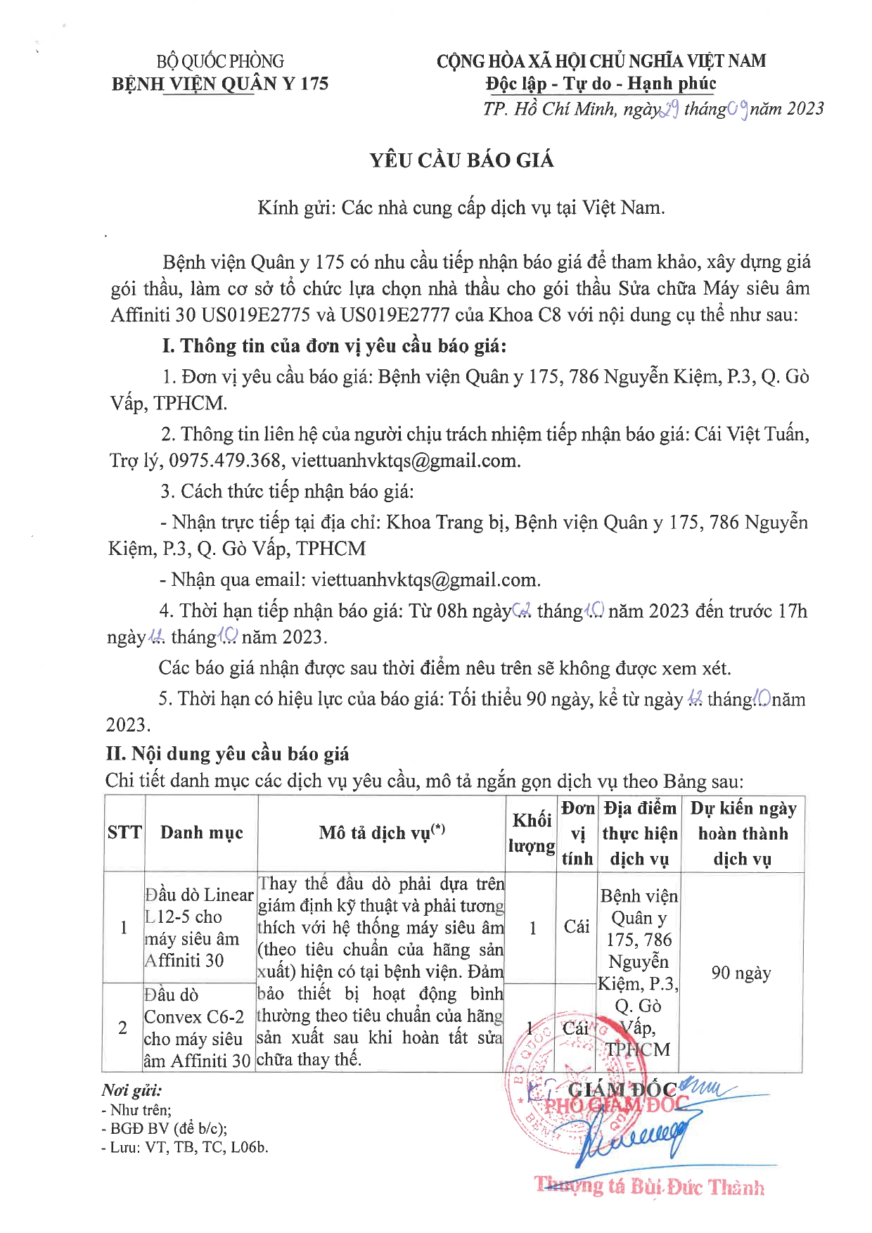 Bệnh viện Quân y 175 có nhu cầu tiếp nhận báo giá để tham khảo, xây dựng giá gói thầu, làm cơ sở tổ chức lựa chọn nhà thầu cho gói thầu Sửa chữa Máy siêu âm Affiniti 30 US019E2775 và US019E2777 của Khoa C8 với nội dung cụ thể như sau: