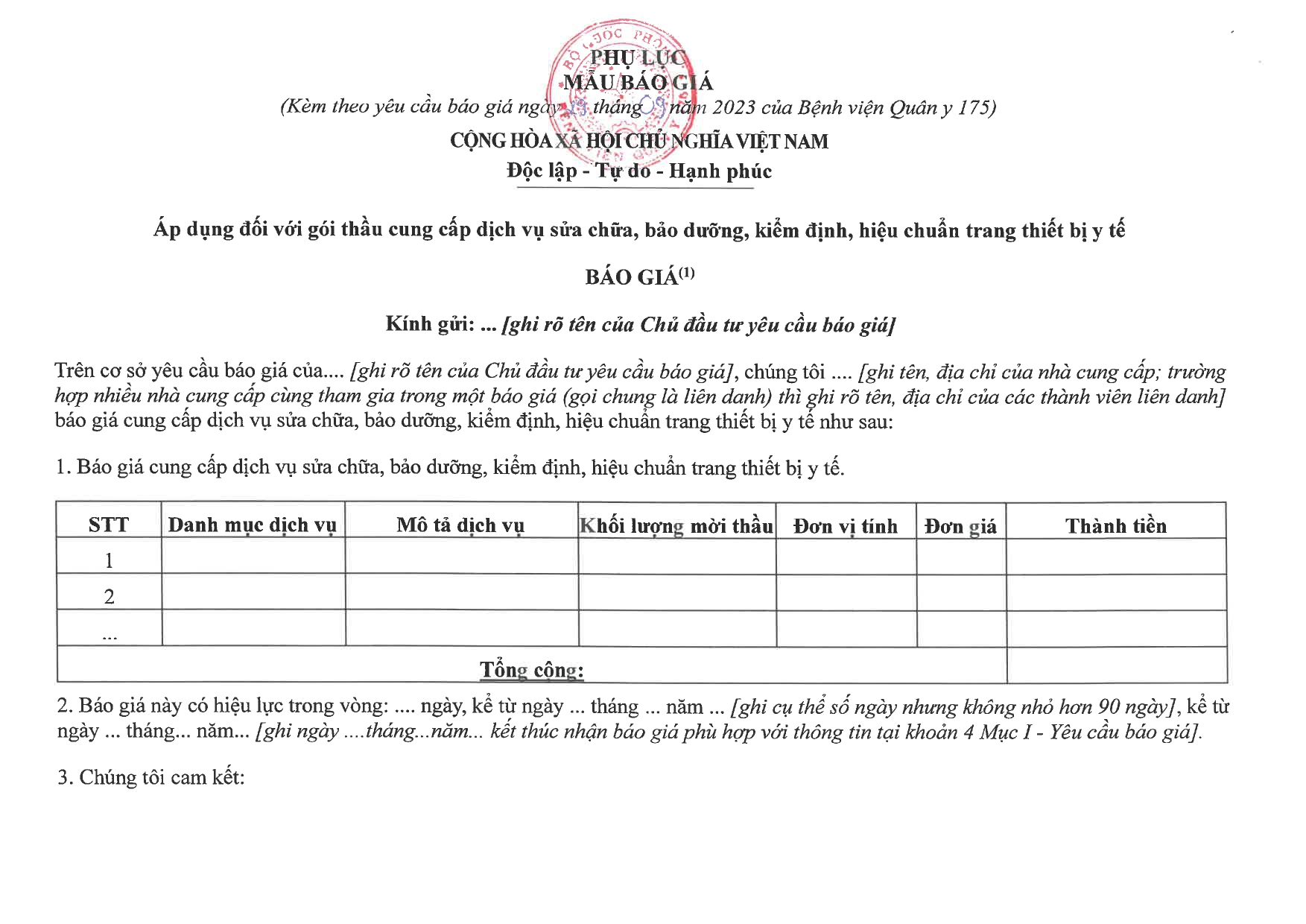 1. Thời hạn tiếp nhận báo giá: Từ 08h ngày … tháng … năm 2023 đến trước 17h ngày … tháng … năm 2023.