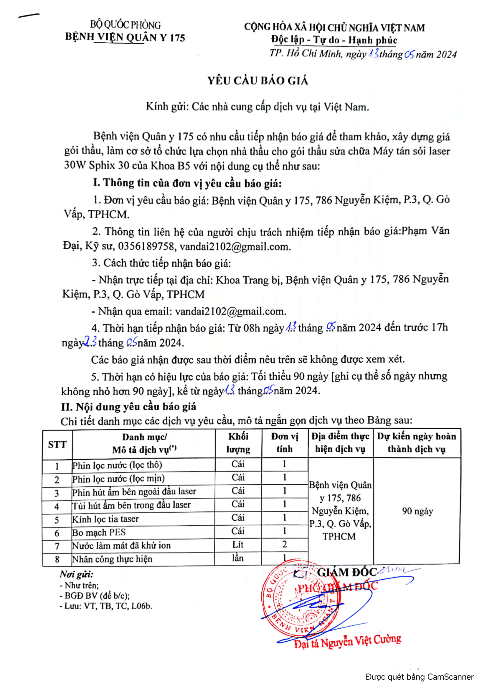 1. Thời hạn tiếp nhận báo giá: Từ 08h ngày 13 tháng 05 năm 2024 đến trước 17h ngày         23 tháng 05 năm 2024.