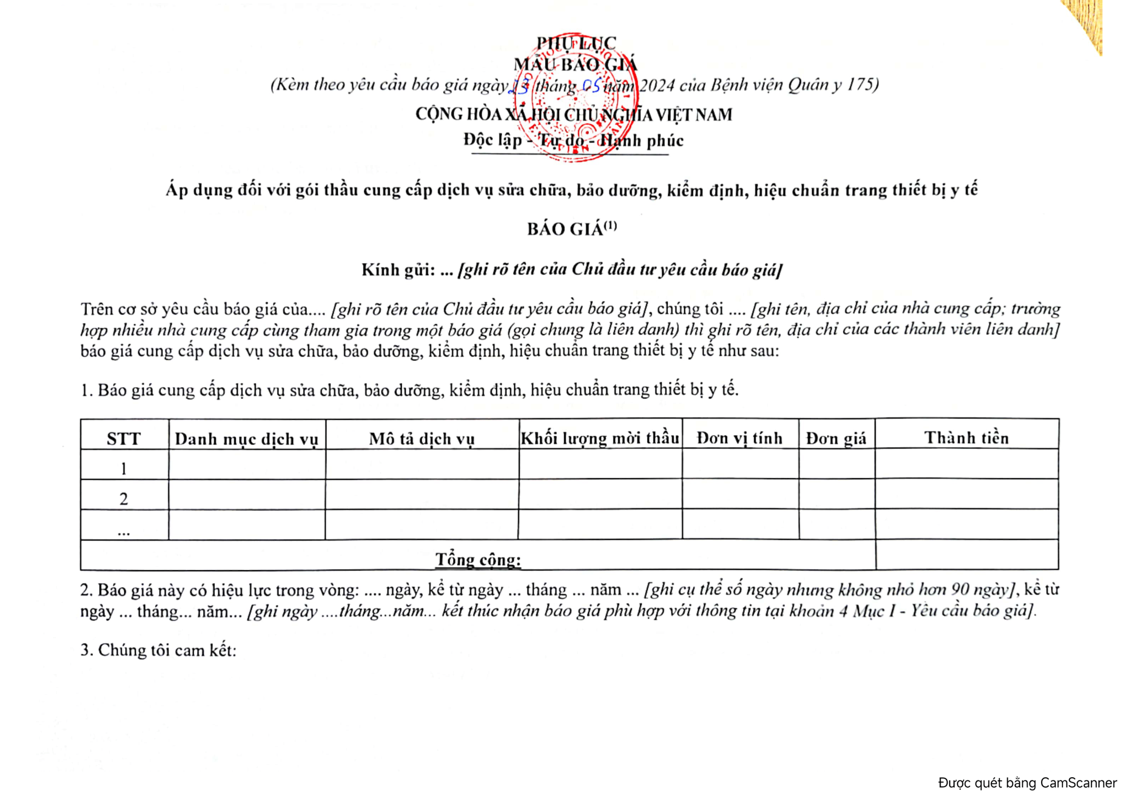 - Đơn vị yêu cầu báo giá: Bệnh viện Quân y 175, 786 Nguyễn Kiệm, P.3, Q. Gò Vấp, TPHCM.