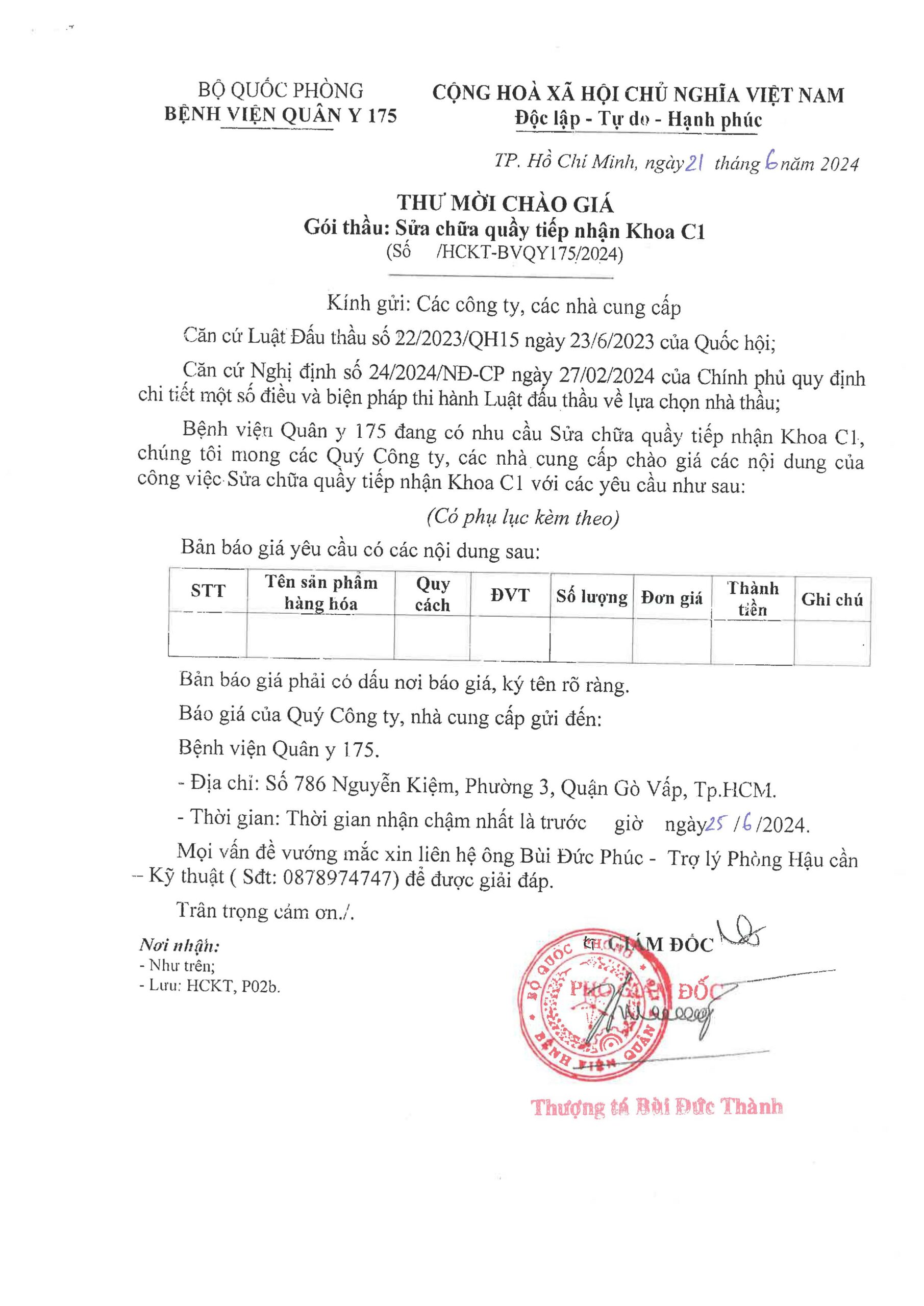 Bệnh viện Quân y 175 có nhu cầu tiếp nhận báo giá để tham khảo, xây dựng giá gói thầu, làm cơ sở tổ chức lựa chọn nhà thầu cho gói thầu