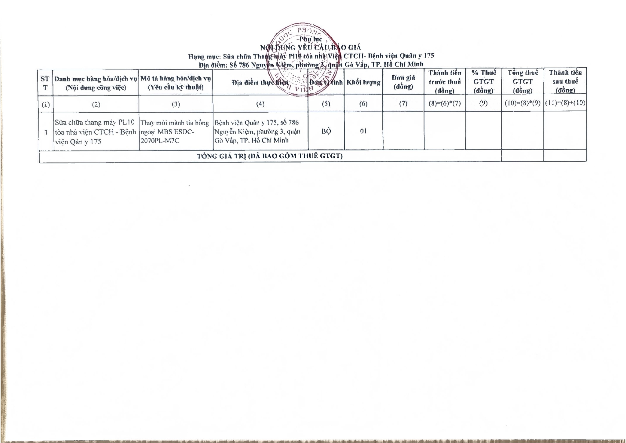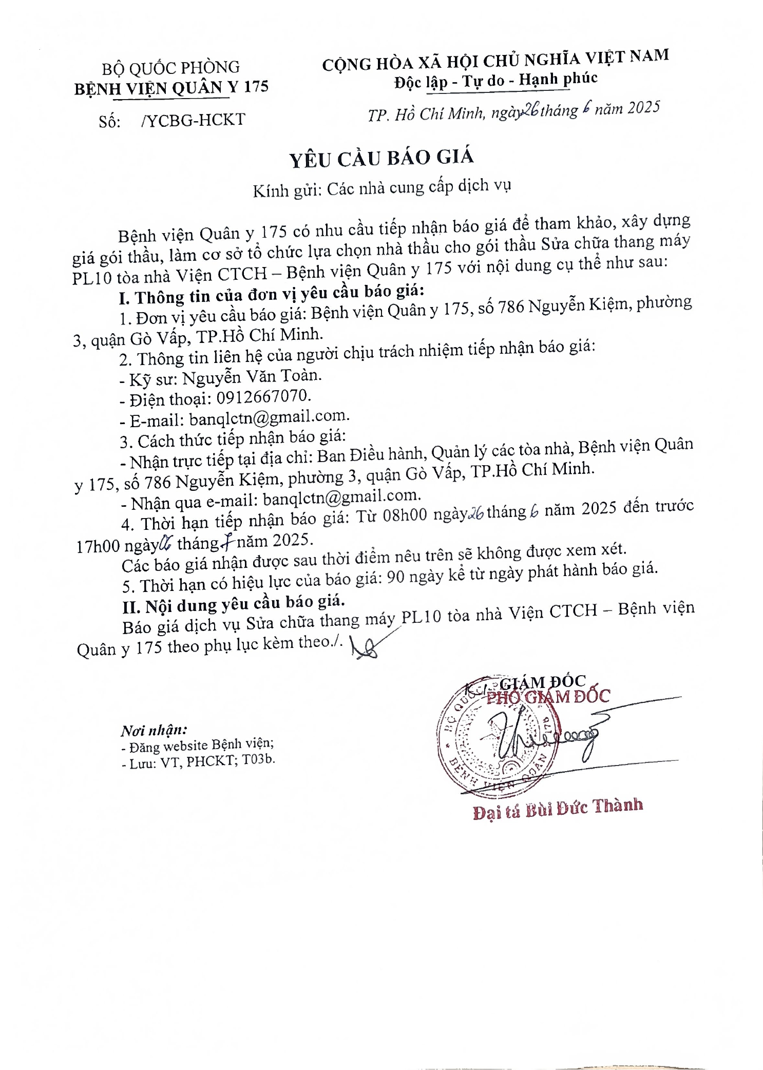 Bệnh viện Quân y 175 có nhu cầu tiếp nhận báo giá để tham khảo, xây dựng giá gói thầu, làm cơ sở tổ chức lựa chọn nhà thầu cho gói thầu Sửa chữa thang máy PL10 tòa nhà Viện CTCH- Bệnh viện Quân y 175.
