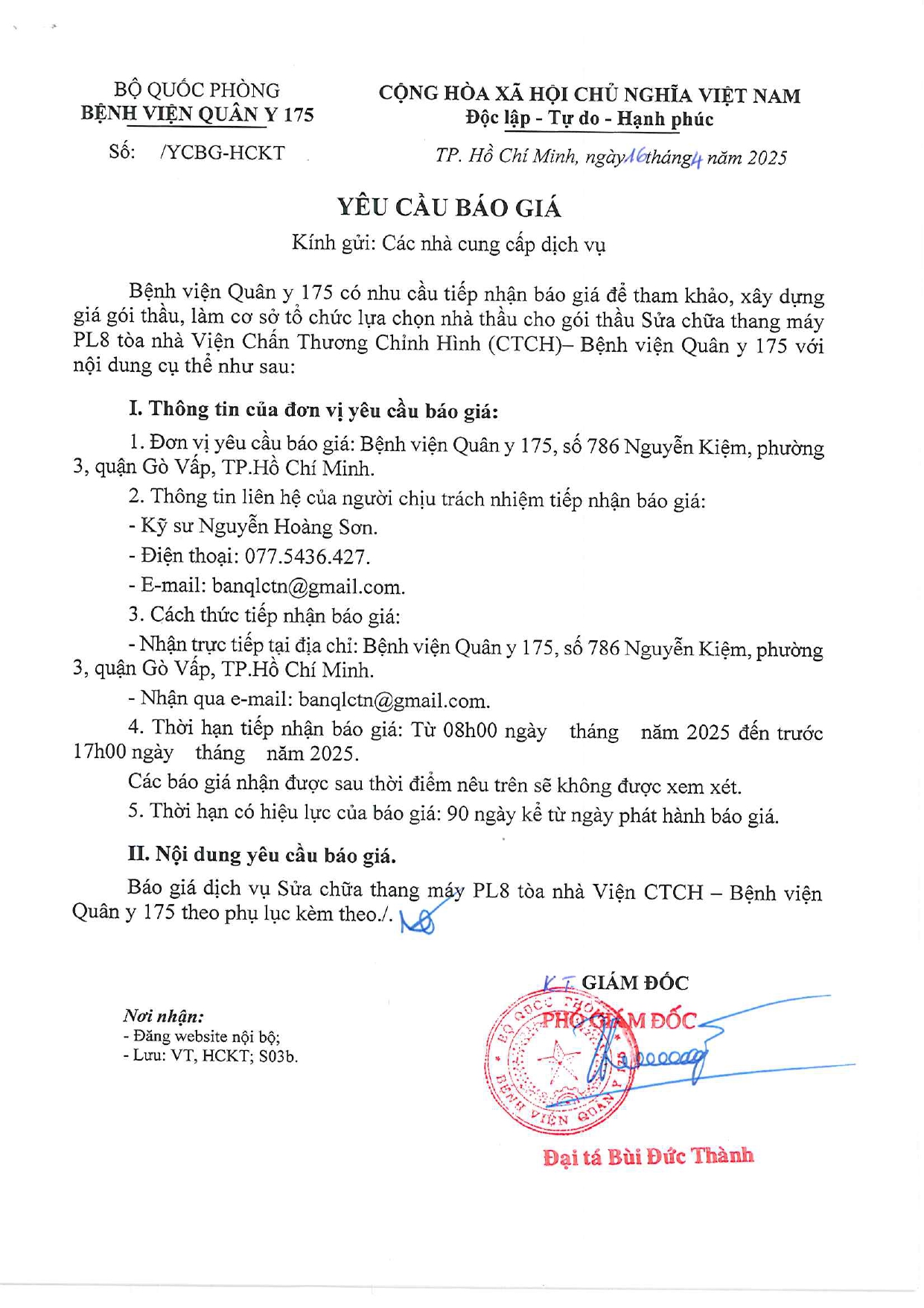Bệnh viện Quân y 175 có nhu cầu tiếp nhận báo giá để tham khảo, xây dựng giá gói thầu, làm cơ sở tổ chức lựa chọn nhà thầu cho gói thầu Sửa chữa thang máy PL8 tòa nhà Viện Chấn thương chỉnh hình.