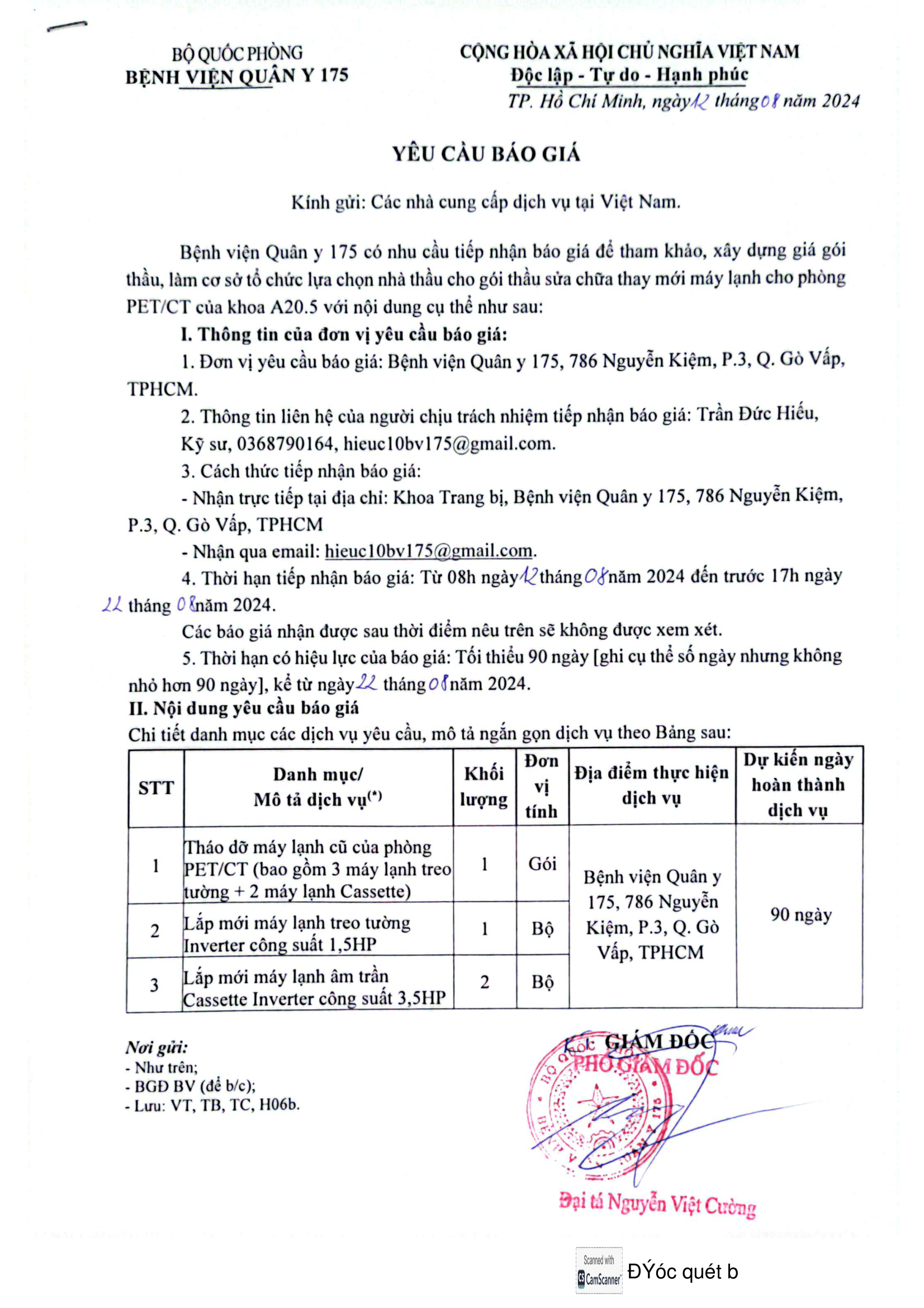 - Thời hạn tiếp nhận báo giá: Từ 08h ngày 12 tháng 08 năm 2024 đến trước 17h ngày 22 tháng 08 năm 2024.