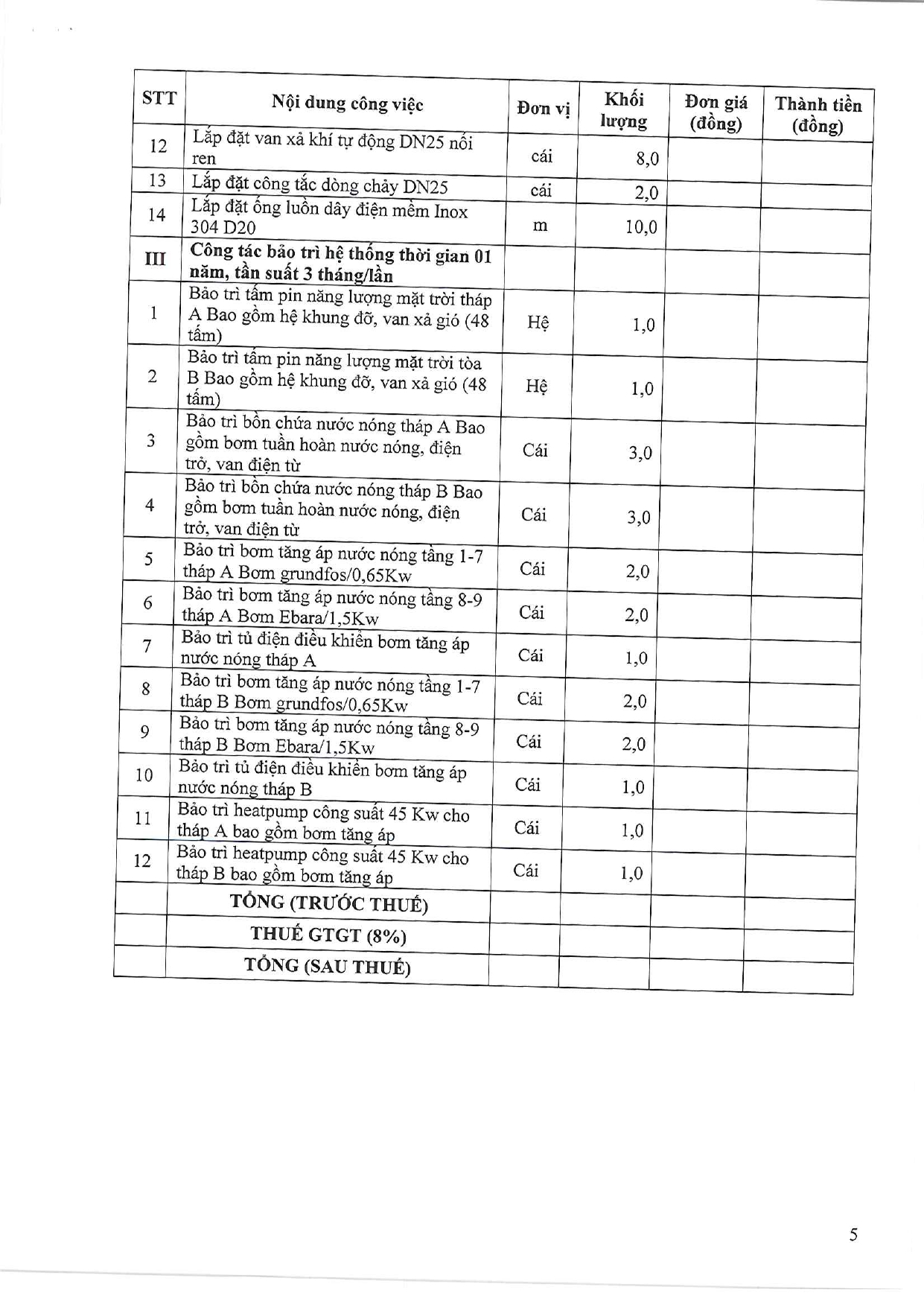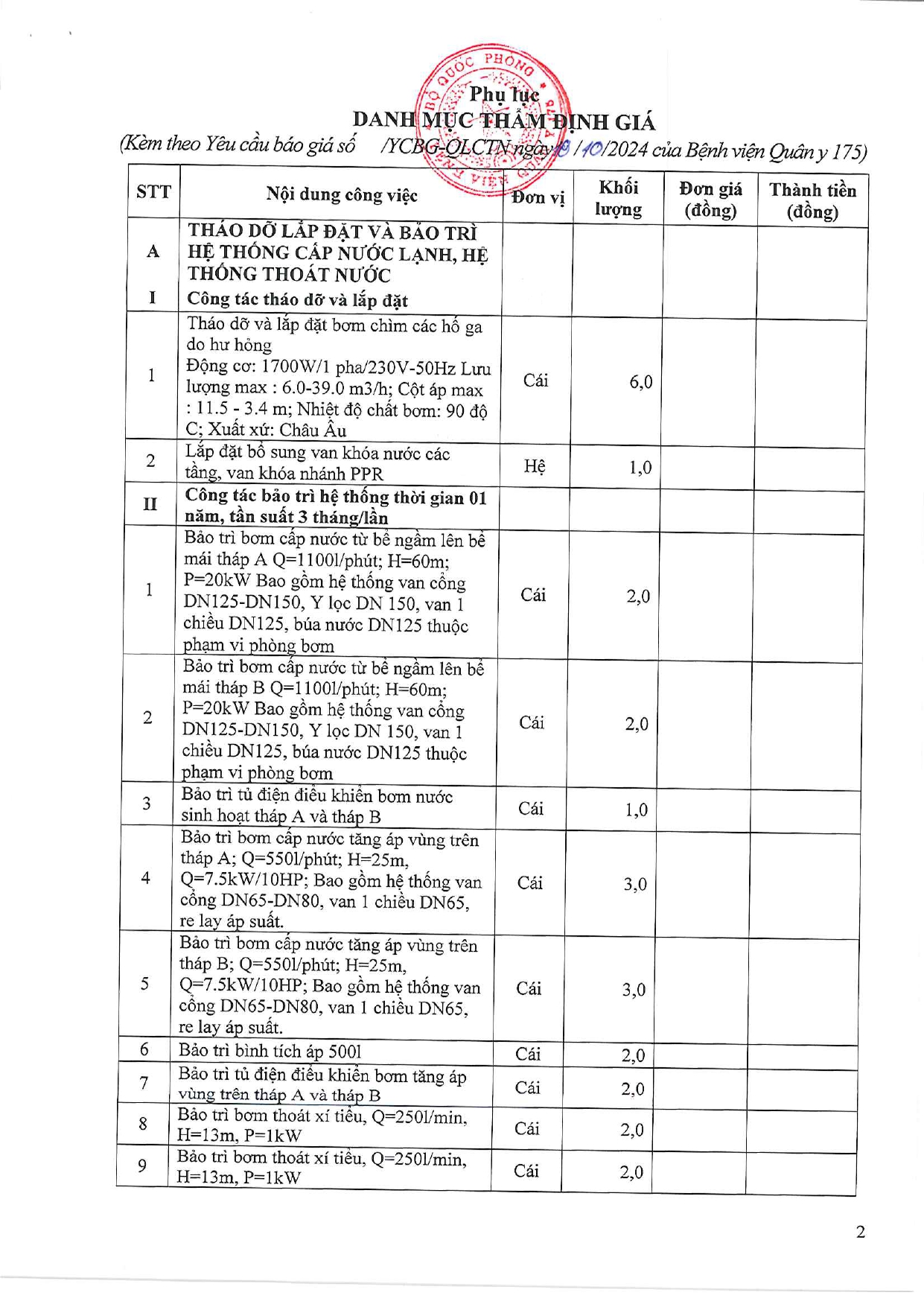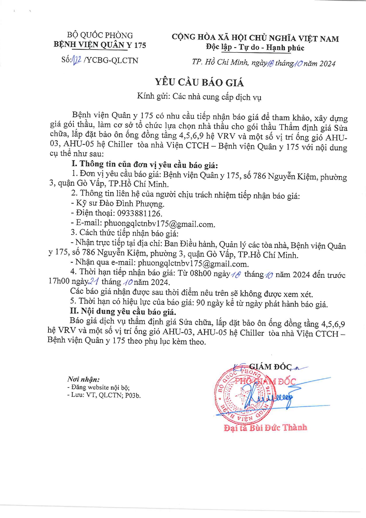 Bệnh viện Quân y 175 có nhu cầu tiếp nhận báo giá để tham khảo, xây dựng giá gói thầu, làm cơ sở tổ chức lựa chọn nhà thầu cho gói thầu Thẩm định giá Sửa chữa, lắp đặt bảo ôn ống đồng tầng 4,5,6,9 hệ VRV và một số vị trí ống gió AHU-03, AHU-05 hệ Chiller tòa nhà Viện CTCH – Bệnh viện Quân y 175 với nội dung cụ thể như sau:
