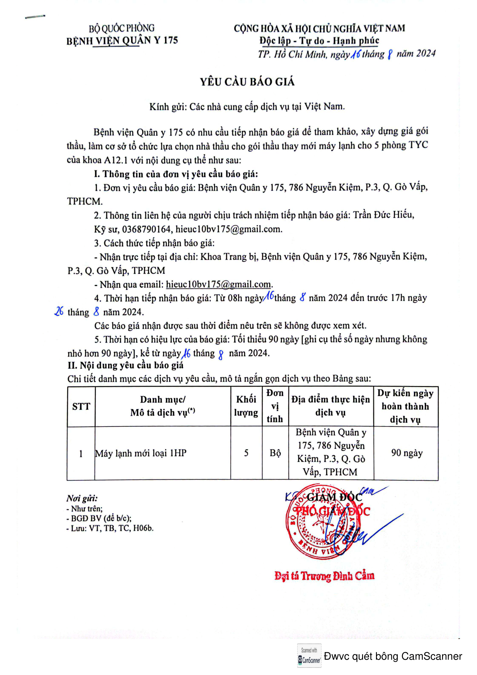 - Đơn vị yêu cầu báo giá: Bệnh viện Quân y 175, 786 Nguyễn Kiệm, P.3, Q. Gò Vấp, TPHCM.