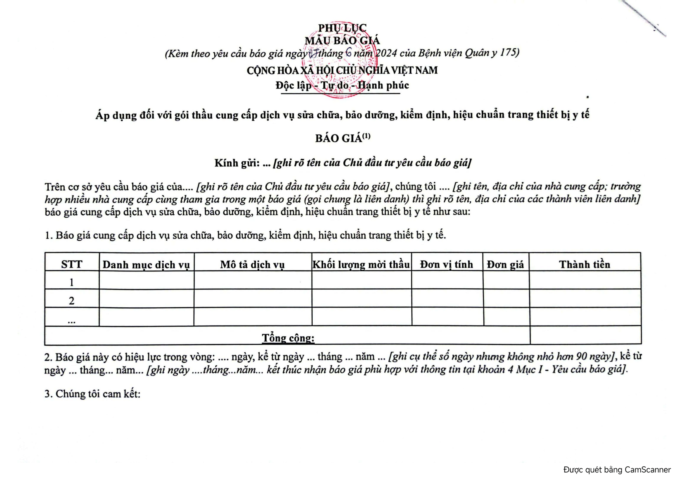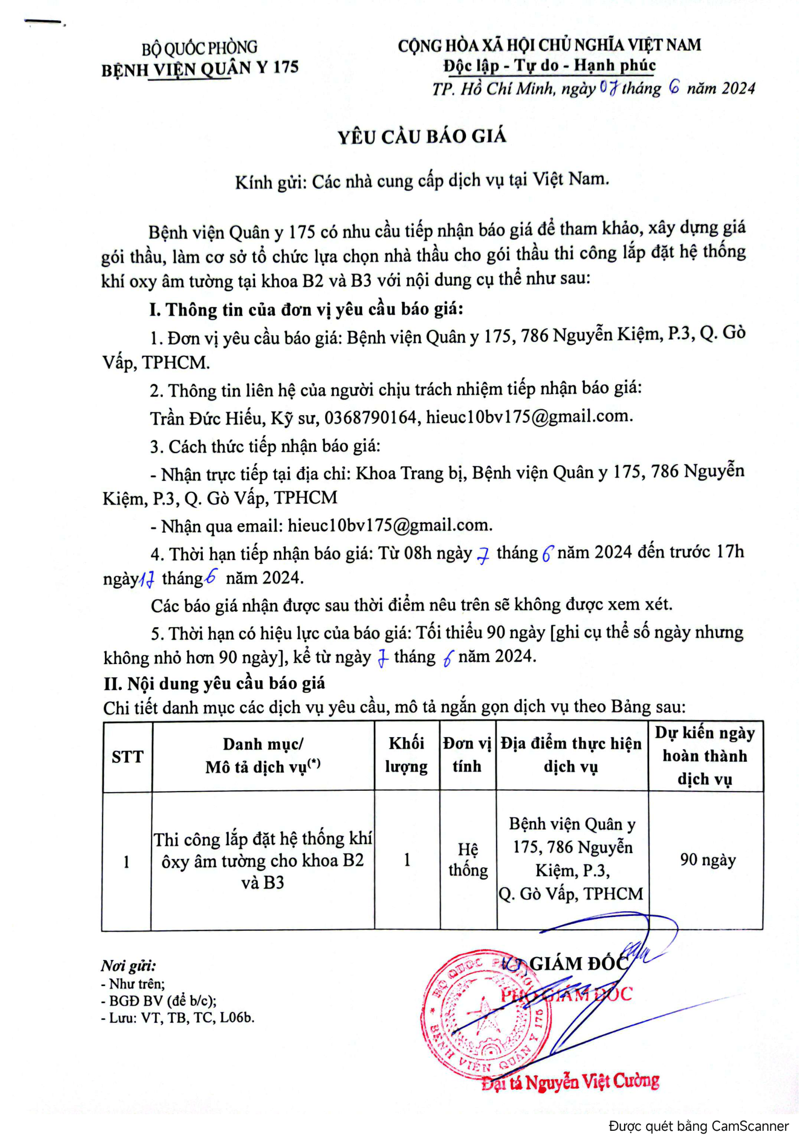 - Đơn vị yêu cầu báo giá: Bệnh viện Quân y 175, 786 Nguyễn Kiệm, P.3, Q. Gò Vấp, TPHCM.