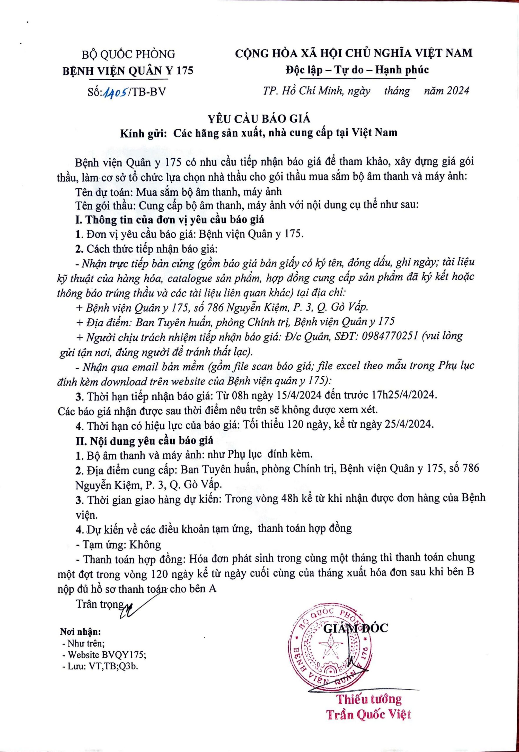 Bệnh viện Quân y 175 có nhu cầu tiếp nhận báo giá để tham khảo, xây dựng giá gói thầu, làm cơ sở tổ chức lựa chọn nhà thầu cho gói thầu thiết kế in ấn, băng rôn, khẩu hiệu, cờ.