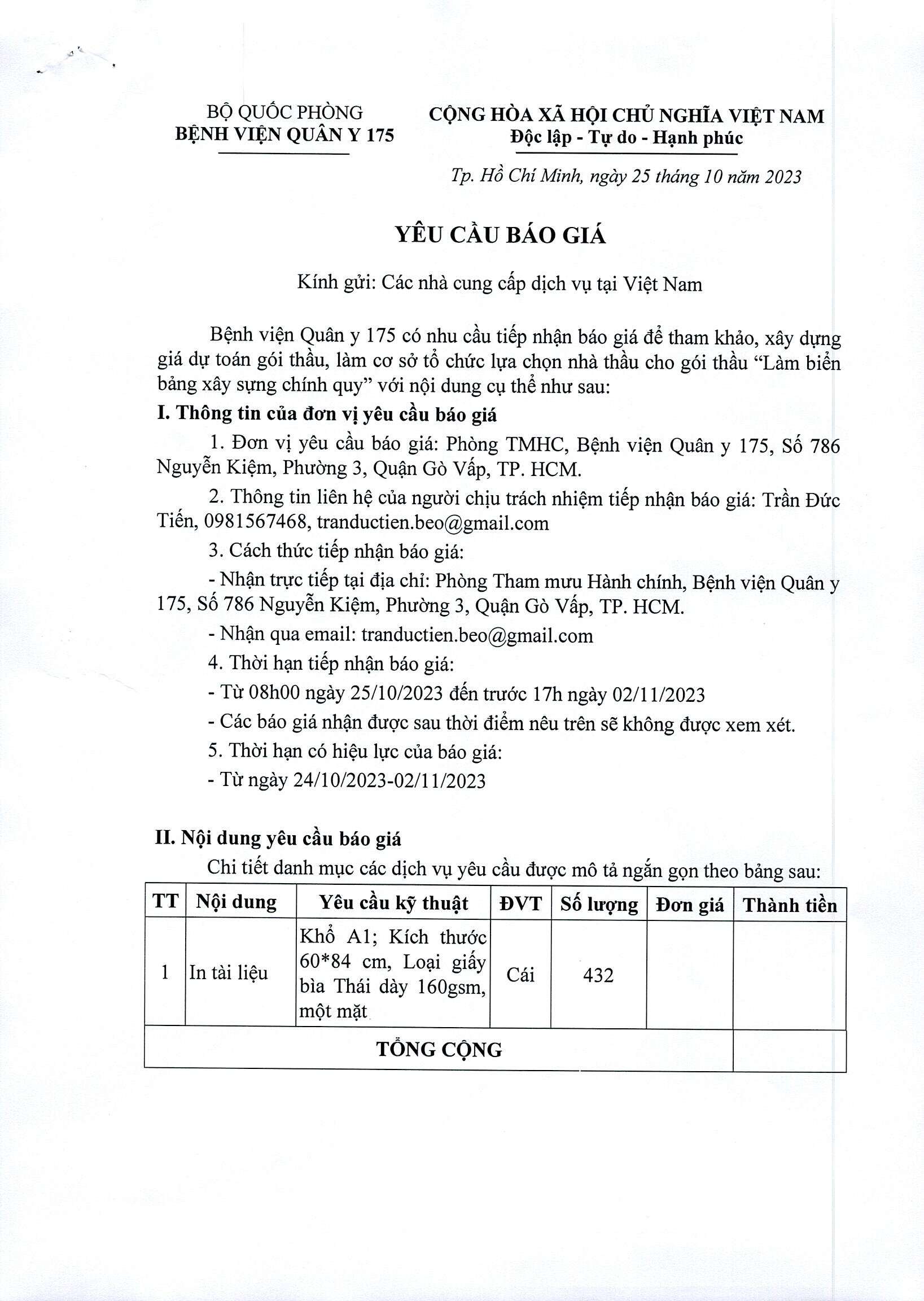 Bệnh viện Quân y 175 có nhu cầu tiếp nhận báo giá để tham khảo, xây dựng giá dự toán gói thầu, làm cơ sở tổ chức lựa chọn nhà thầu cho gói thầu “Làm biển bảng xây dựng chính quy” với nội dung cụ thể như sau:
