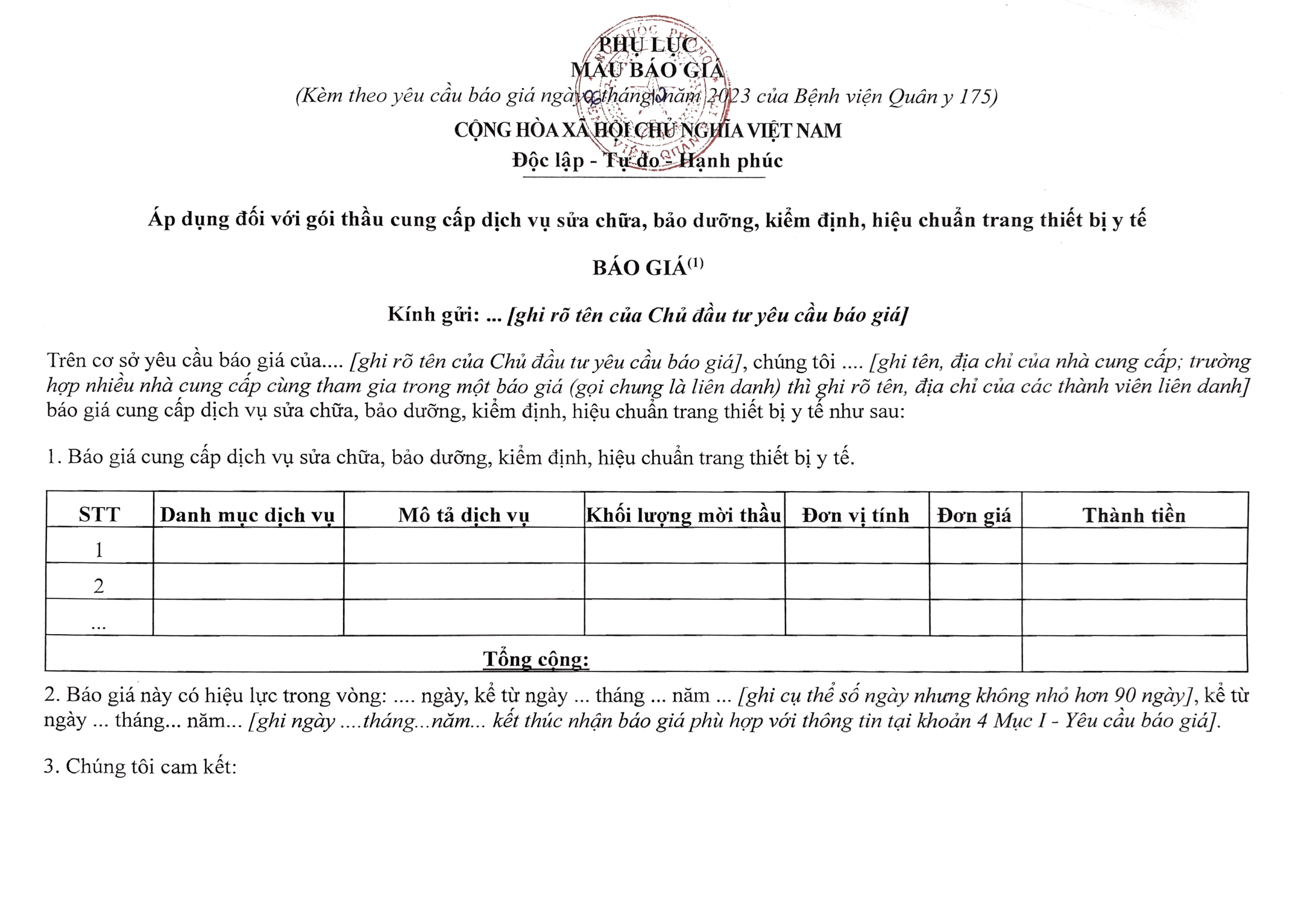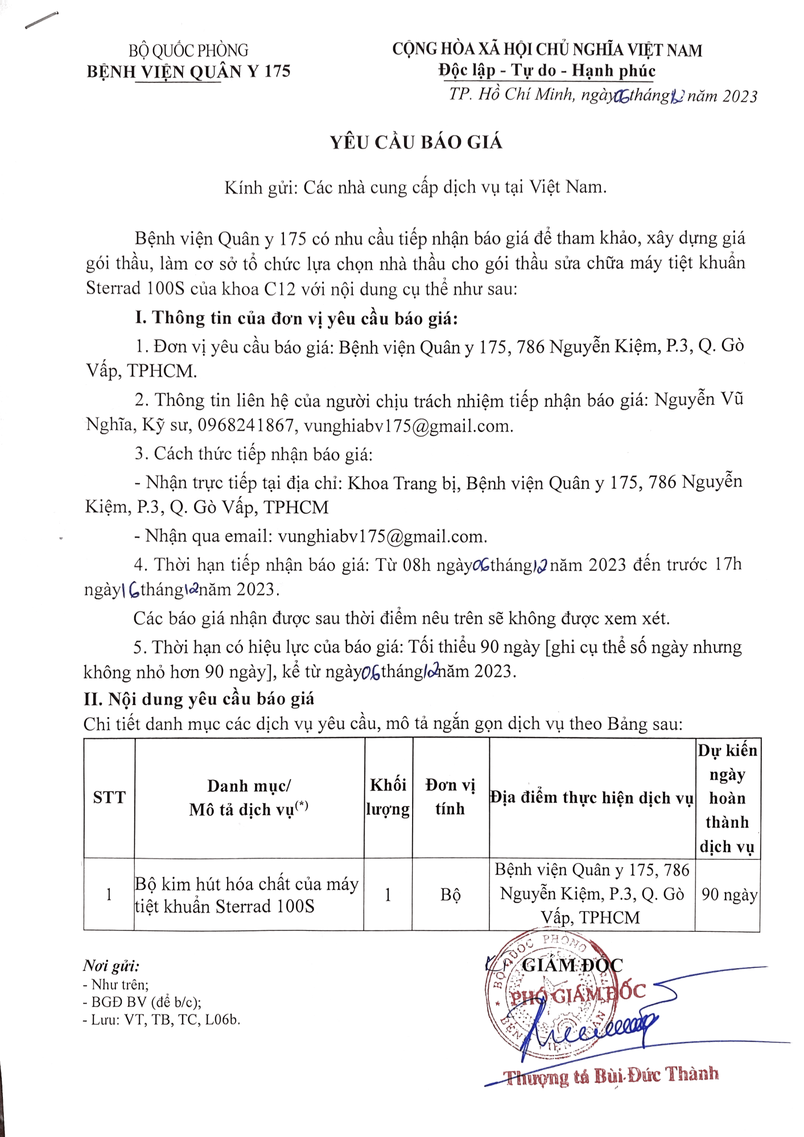 Bệnh viện Quân y 175 có nhu cầu tiếp nhận báo giá để tham khảo, xây dựng giá gói thầu, làm cơ sở tổ chức lựa chọn nhà thầu cho gói thầu sửa chữa máy tiệt khuẩn Sterrad 100S của khoa C12 với nội dung cụ thể như sau: