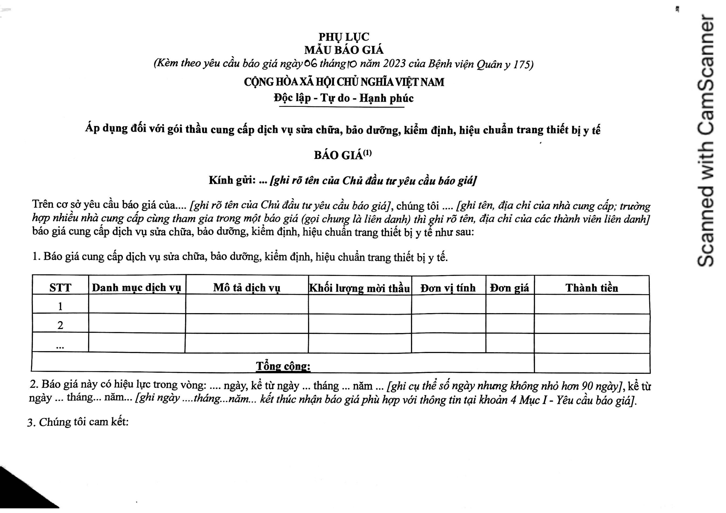 - Đơn vị yêu cầu báo giá: Bệnh viện Quân y 175, 786 Nguyễn Kiệm, P.3, Q. Gò Vấp, TPHCM.