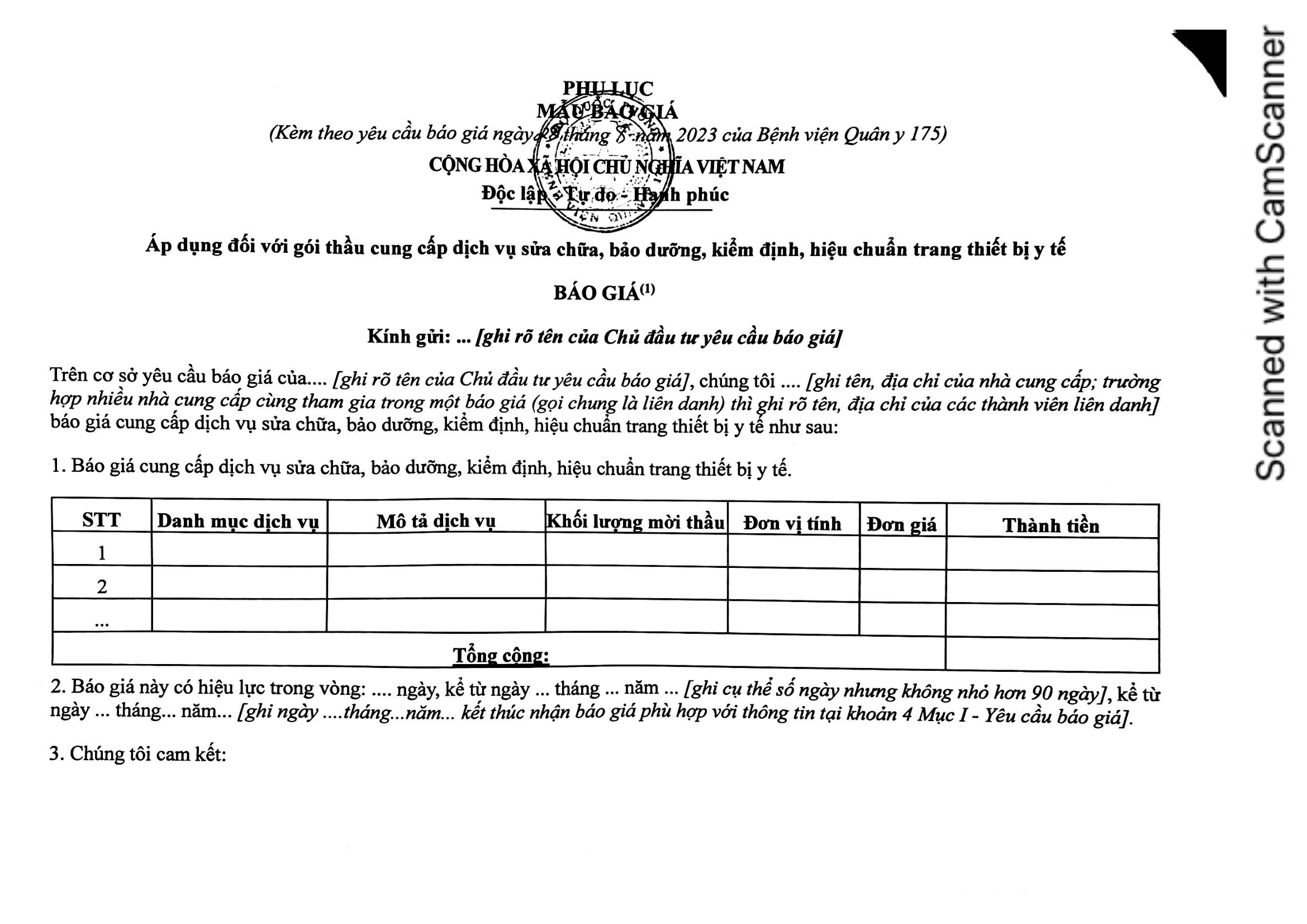 - Đơn vị yêu cầu báo giá: Bệnh viện Quân y 175, 786 Nguyễn Kiệm, P.3, Q. Gò Vấp, TPHCM.