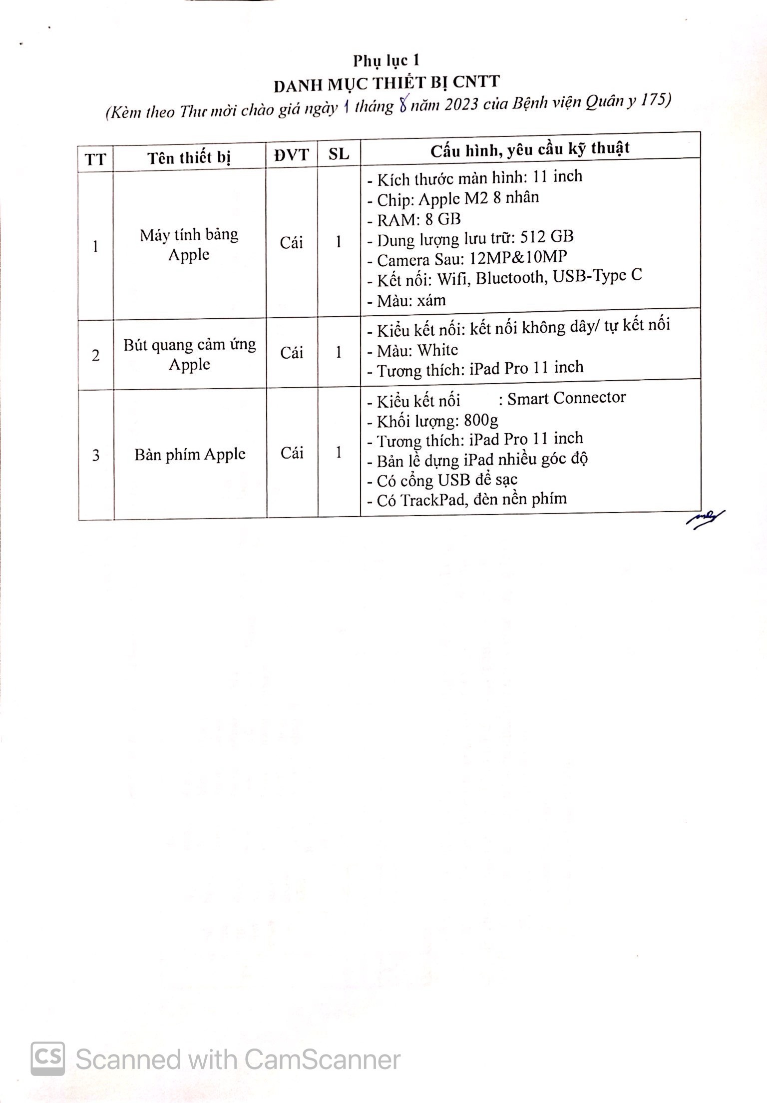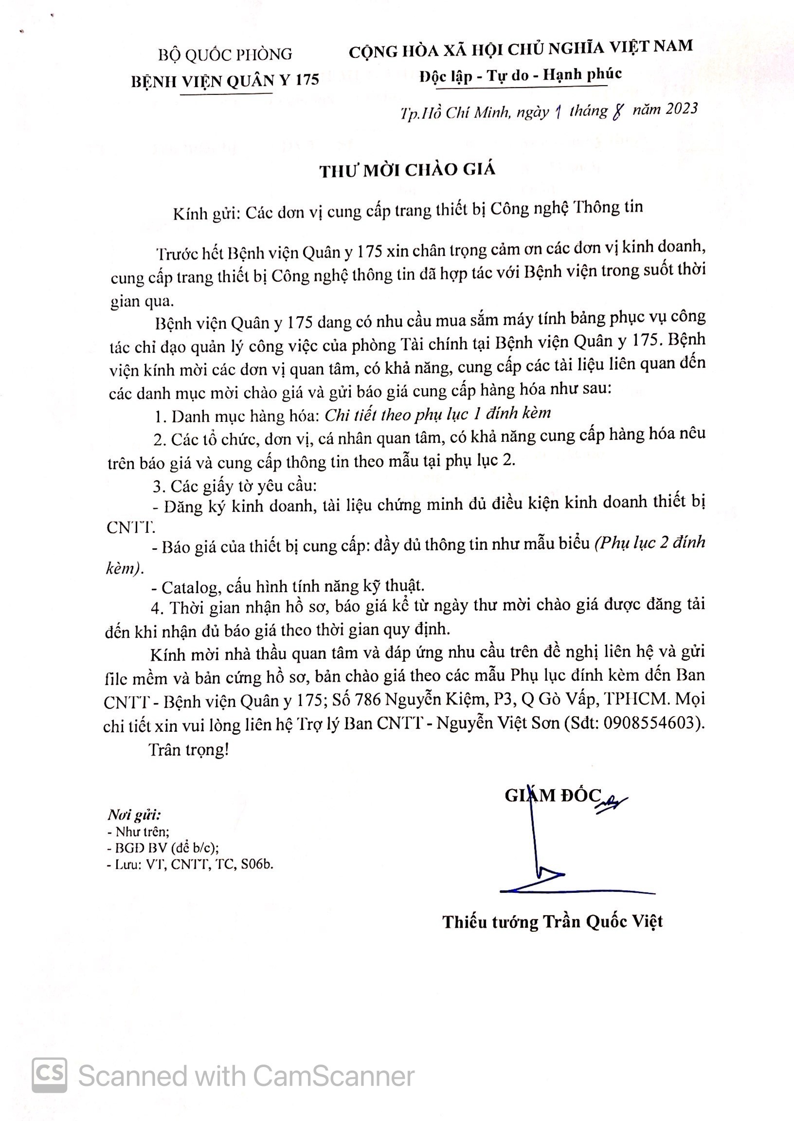 Bệnh viện Quân y 175 đang có nhu cầu mua sắm máy tính bảng phục vụ công tác chỉ đạo quản lý công việc của phòng Tài chính tại Bệnh viện Quân y 175. Bệnh viện kính mời các đơn vị quan tâm, có khả năng, cung cấp các tài liệu liên quan đến các danh mục mời chào giá và gửi báo giá cung cấp hàng hóa như sau:
