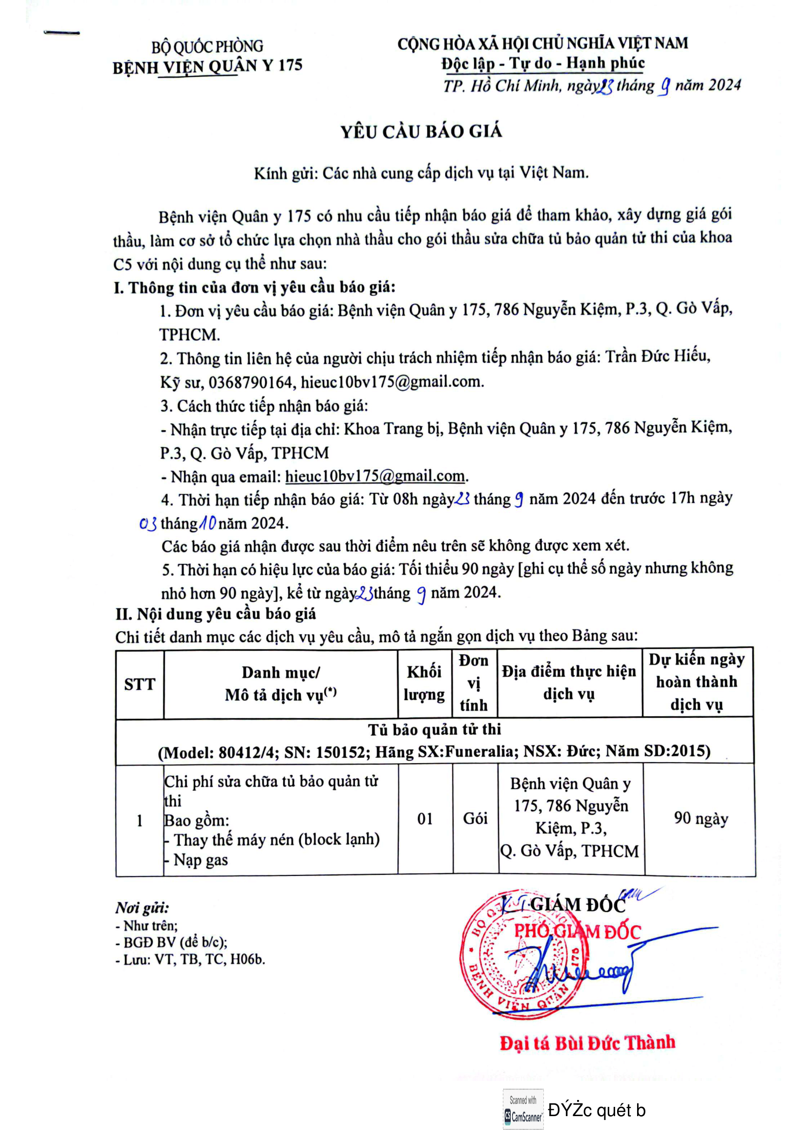 Bệnh viện Quân y 175 có nhu cầu tiếp nhận báo giá để tham khảo, xây dựng giá gói thầu, làm cơ sở tổ chức lựa chọn nhà thầu cho gói thầu sửa chữa tủ bảo quản tử thi của khoa C5 với nội dung cụ thể như sau: