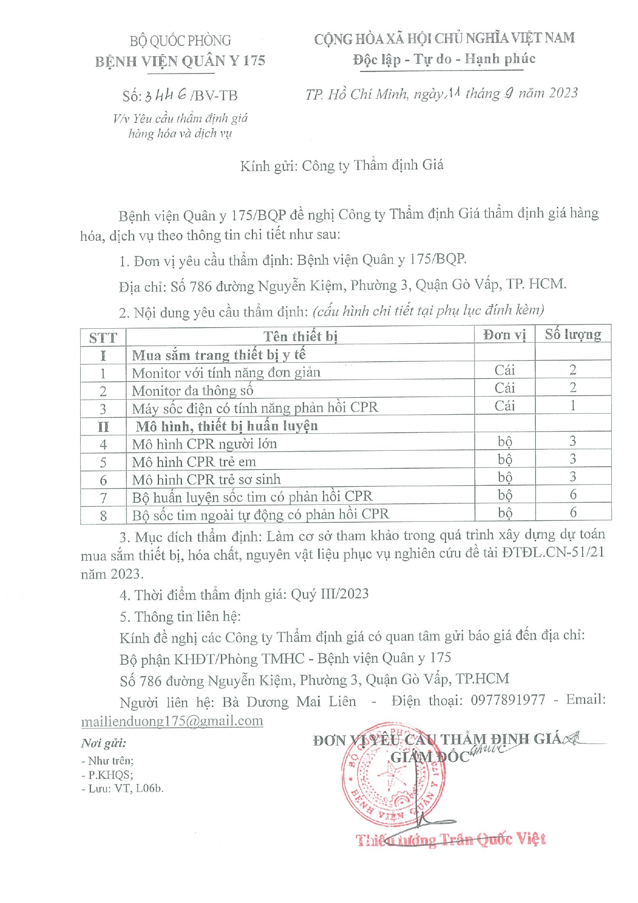 Bệnh viện Quân y 175/BQP đề nghị Công ty Thẩm định Giá thẩm định giá hàng hóa, dịch vụ theo thông tin chi tiết như sau: