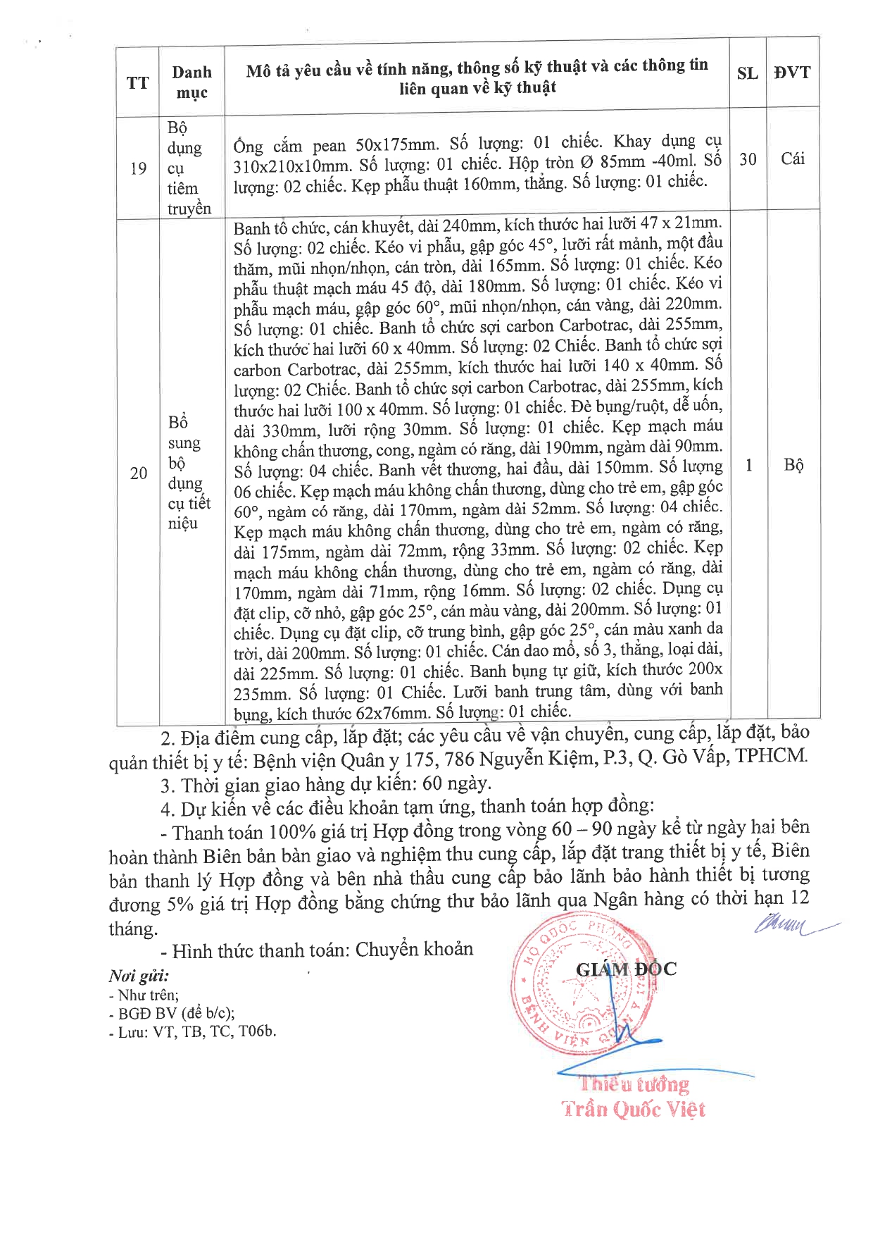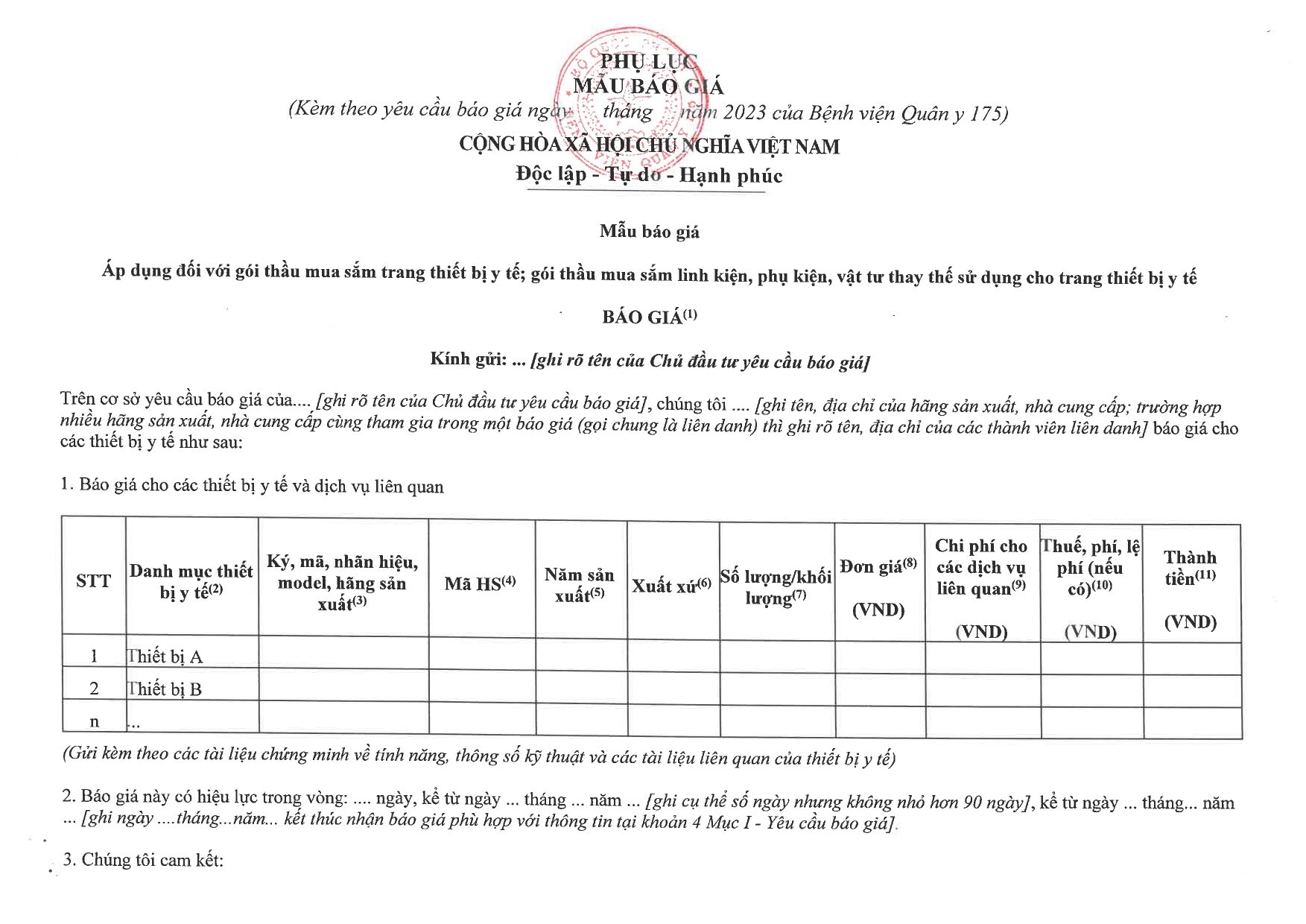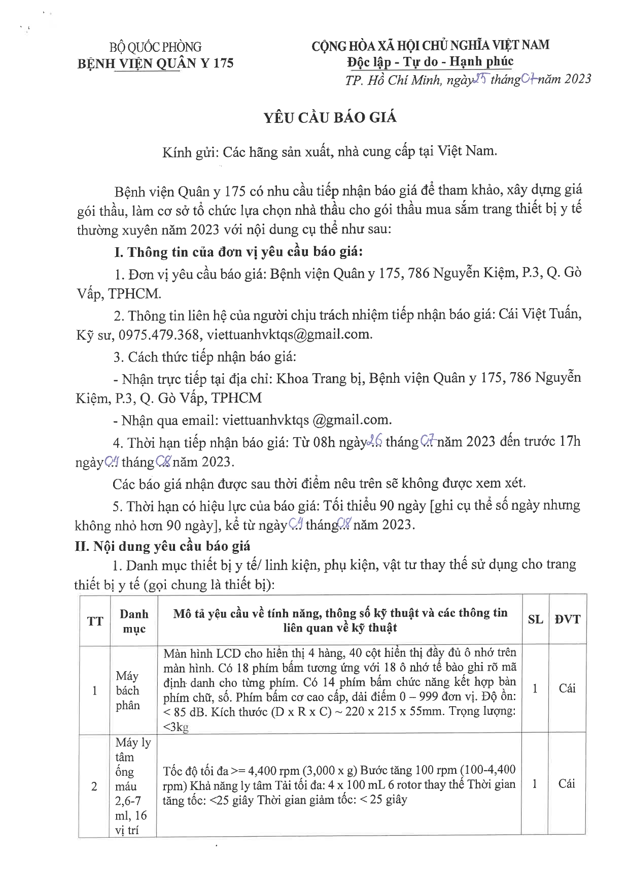 - Đơn vị yêu cầu báo giá: Bệnh viện Quân y 175, 786 Nguyễn Kiệm, P.3, Q. Gò Vấp, TPHCM.