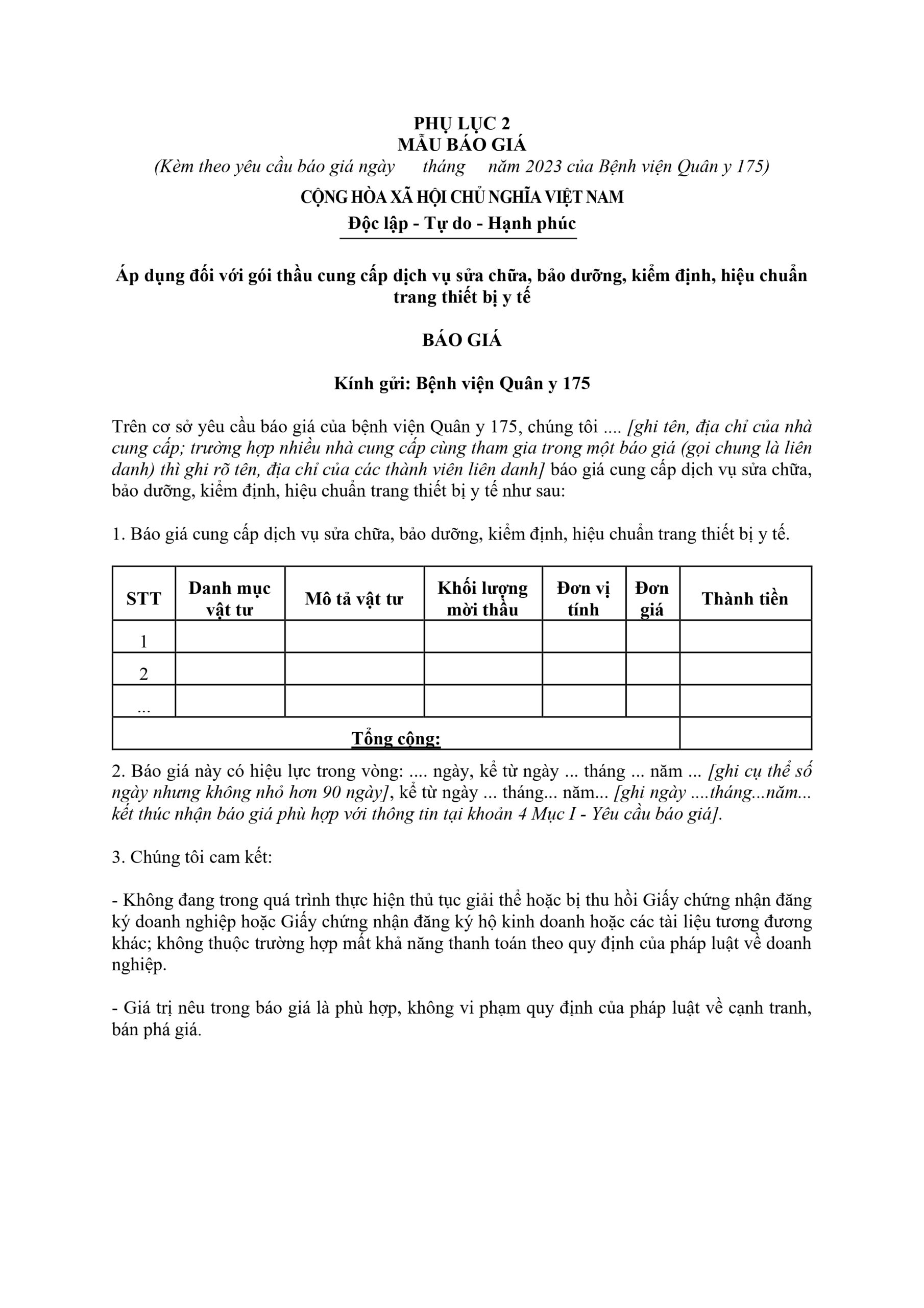 2. Đơn vị yêu cầu báo giá: Bệnh viện Quân y 175.
