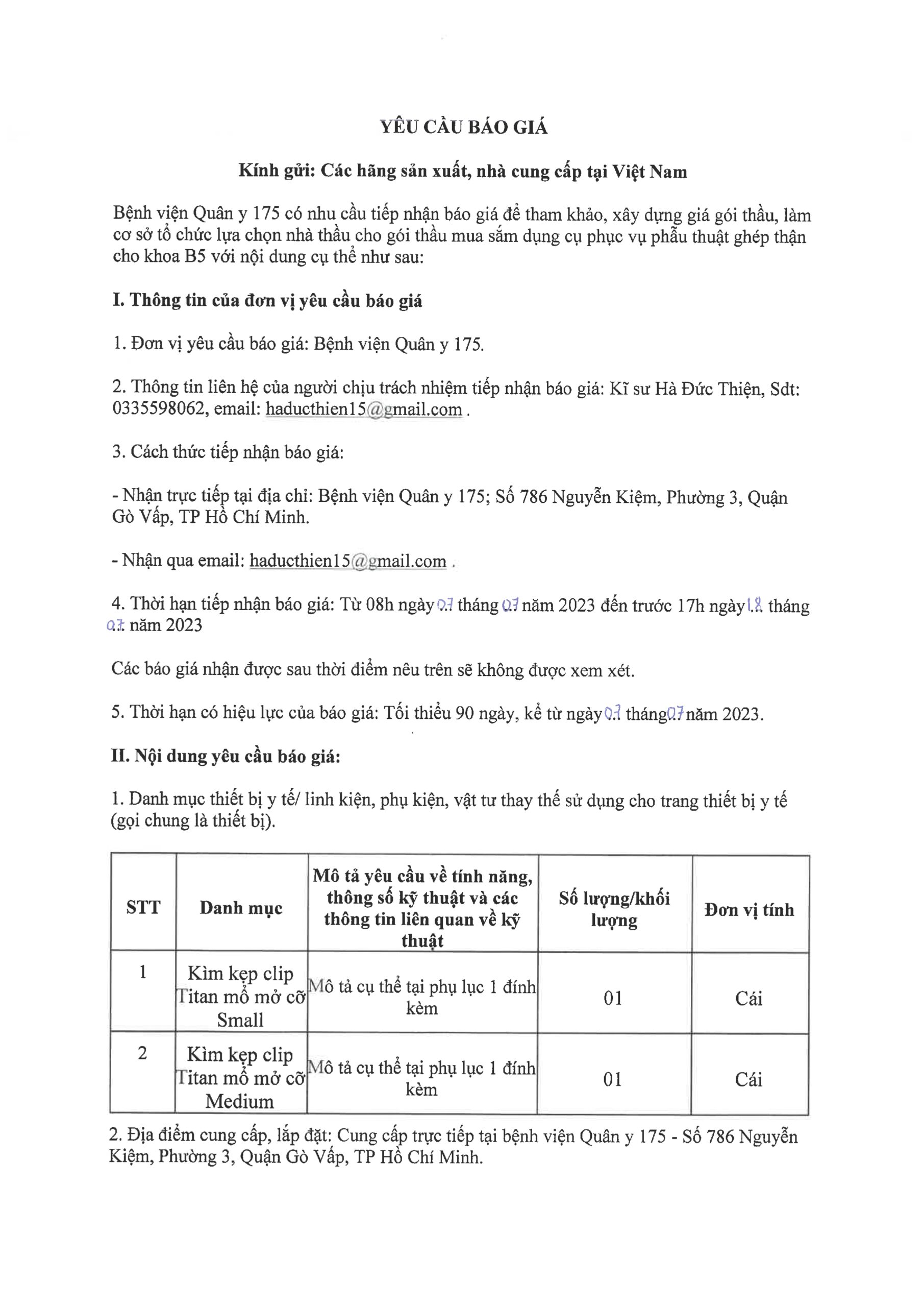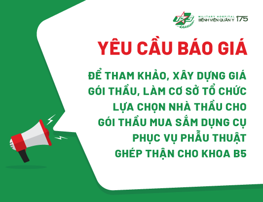 Bệnh viện Quân y 175 có nhu cầu tiếp nhận báo giá để tham khảo, xây dựng giá gói thầu, làm cơ sở tổ chức lựa chọn nhà thầu cho gói thầu mua sắm dụng cụ phục vụ phẫu thuật ghép thận cho khoa B5 với nội dung cụ thể như sau:
